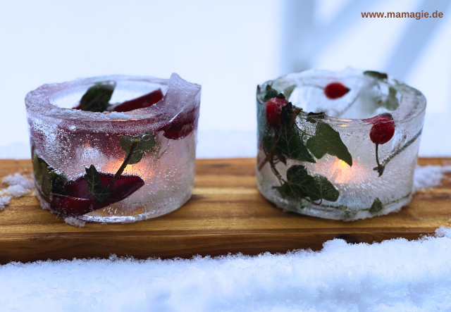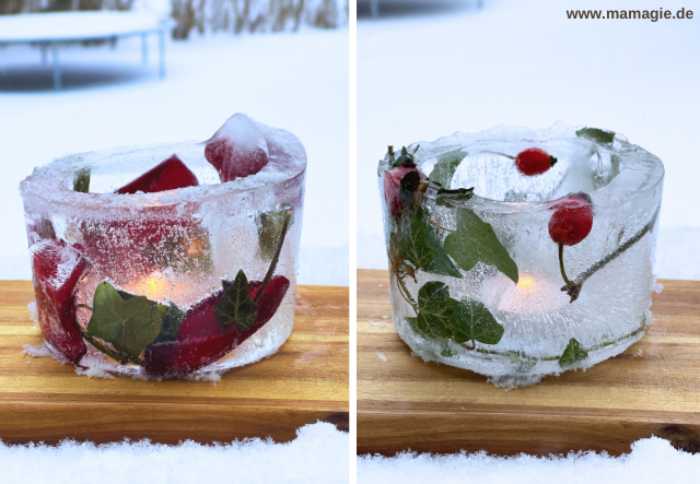 - Nun stellt ihr noch ein (elektrisches) Teelicht in die Eislaterne und genießt die gemütliche Stimmung!